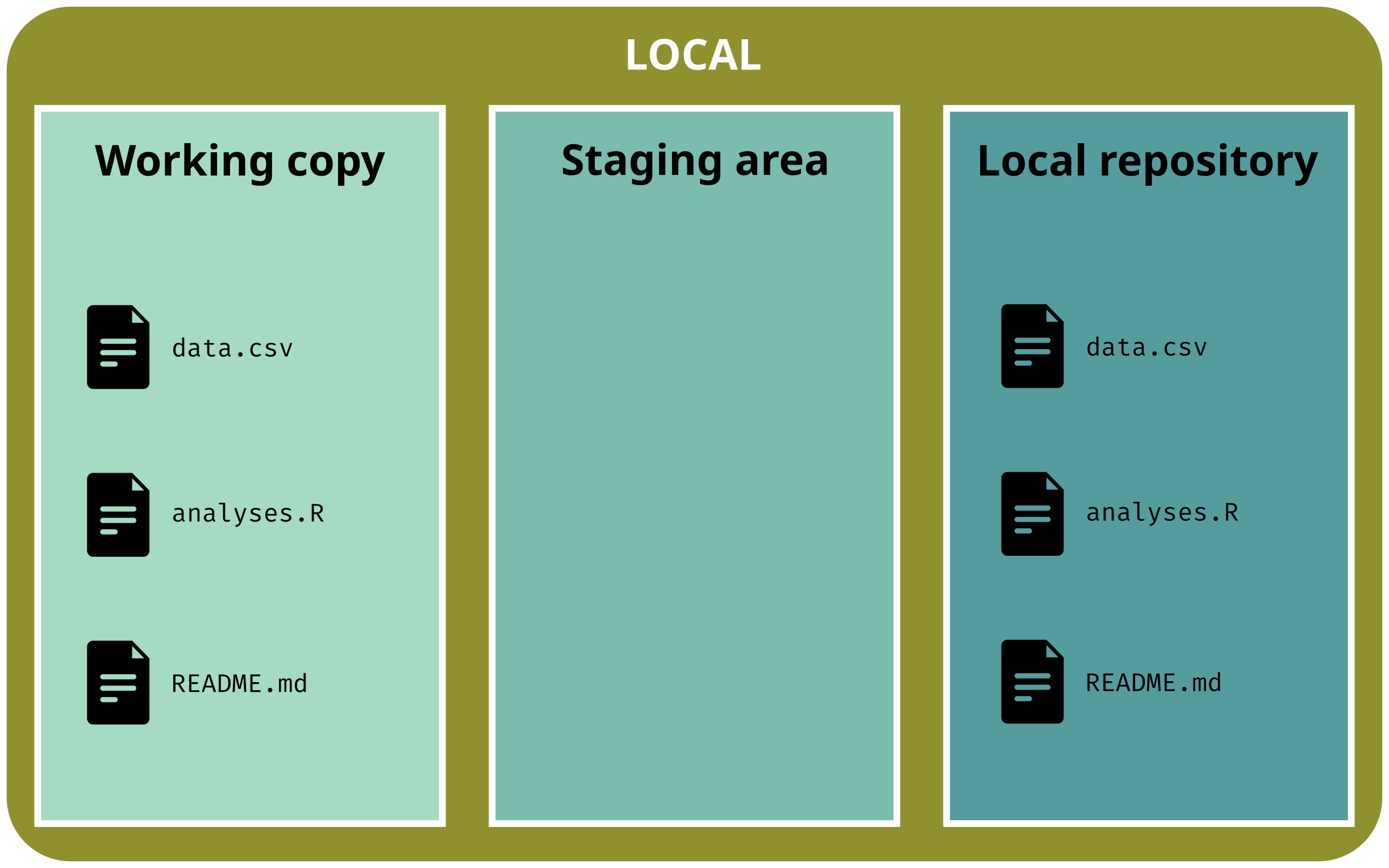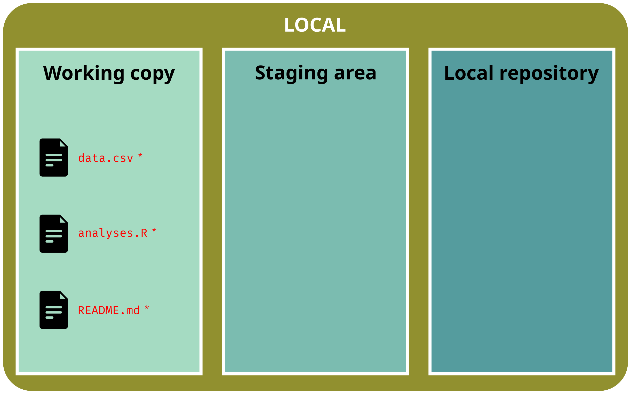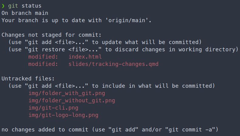 git status# On branch main# # No commits yet# # Untracked files:# README.md# analyses.R# data.csv# # Nothing added to commit but untracked files present# Use "git add <file>..." to track