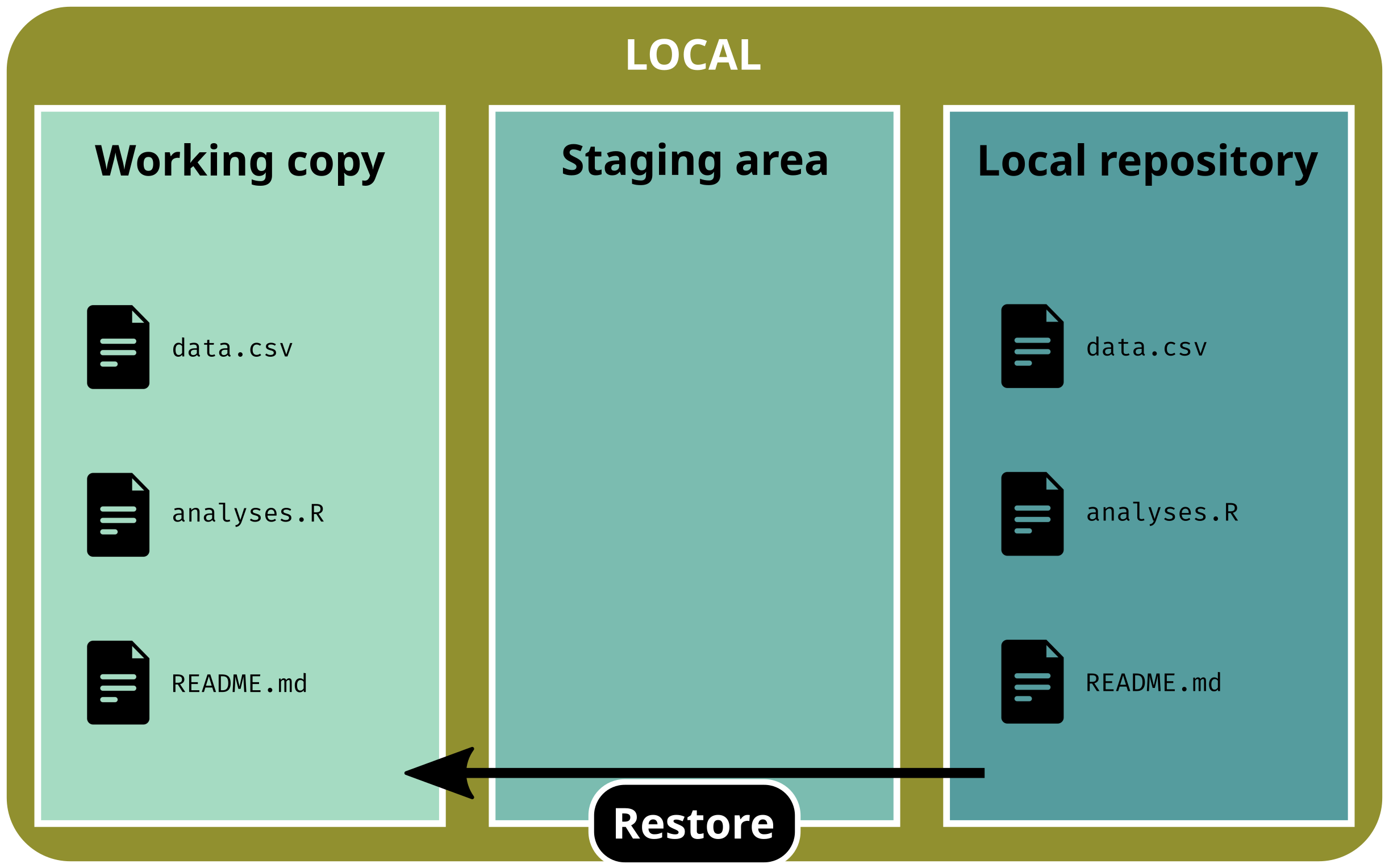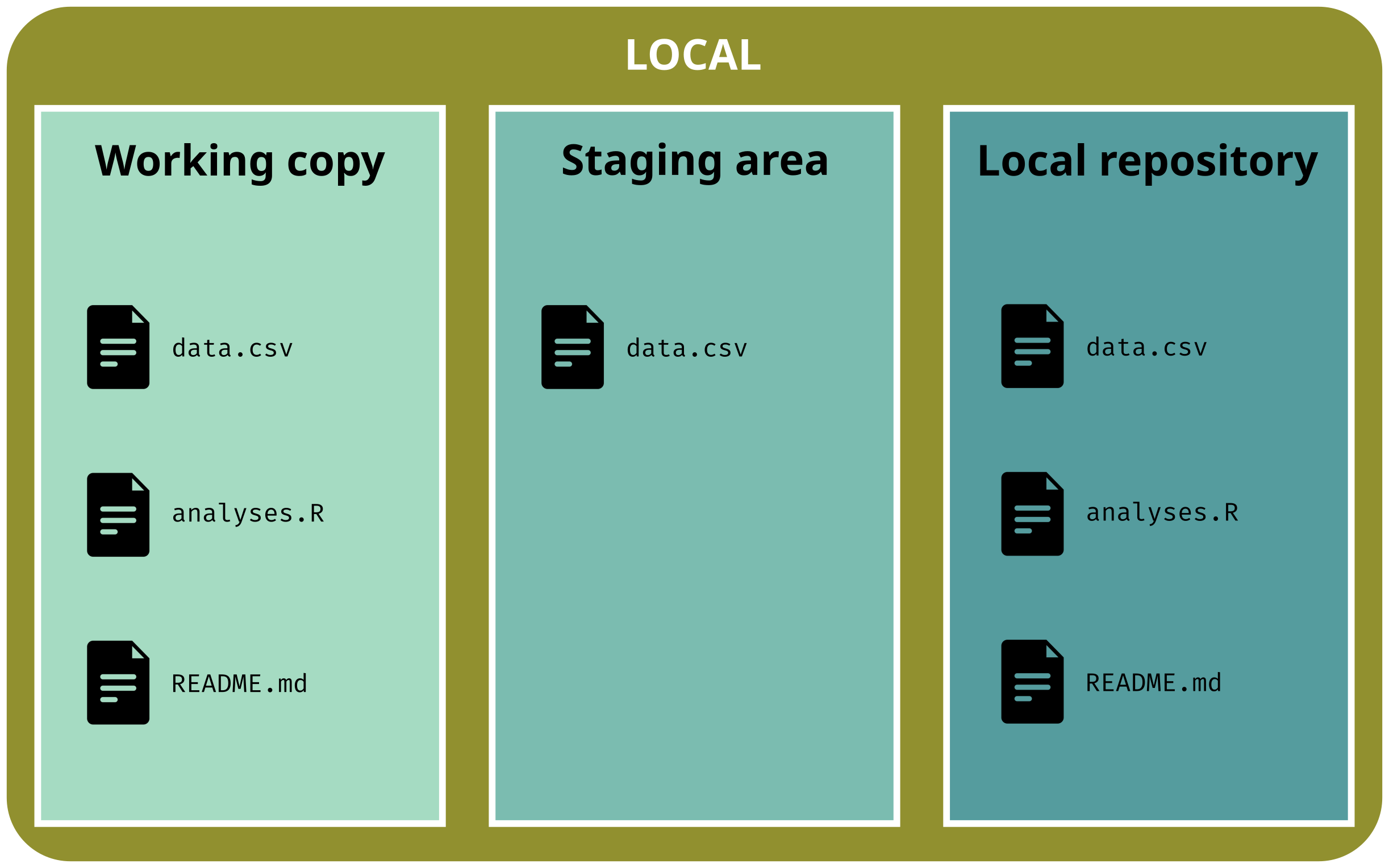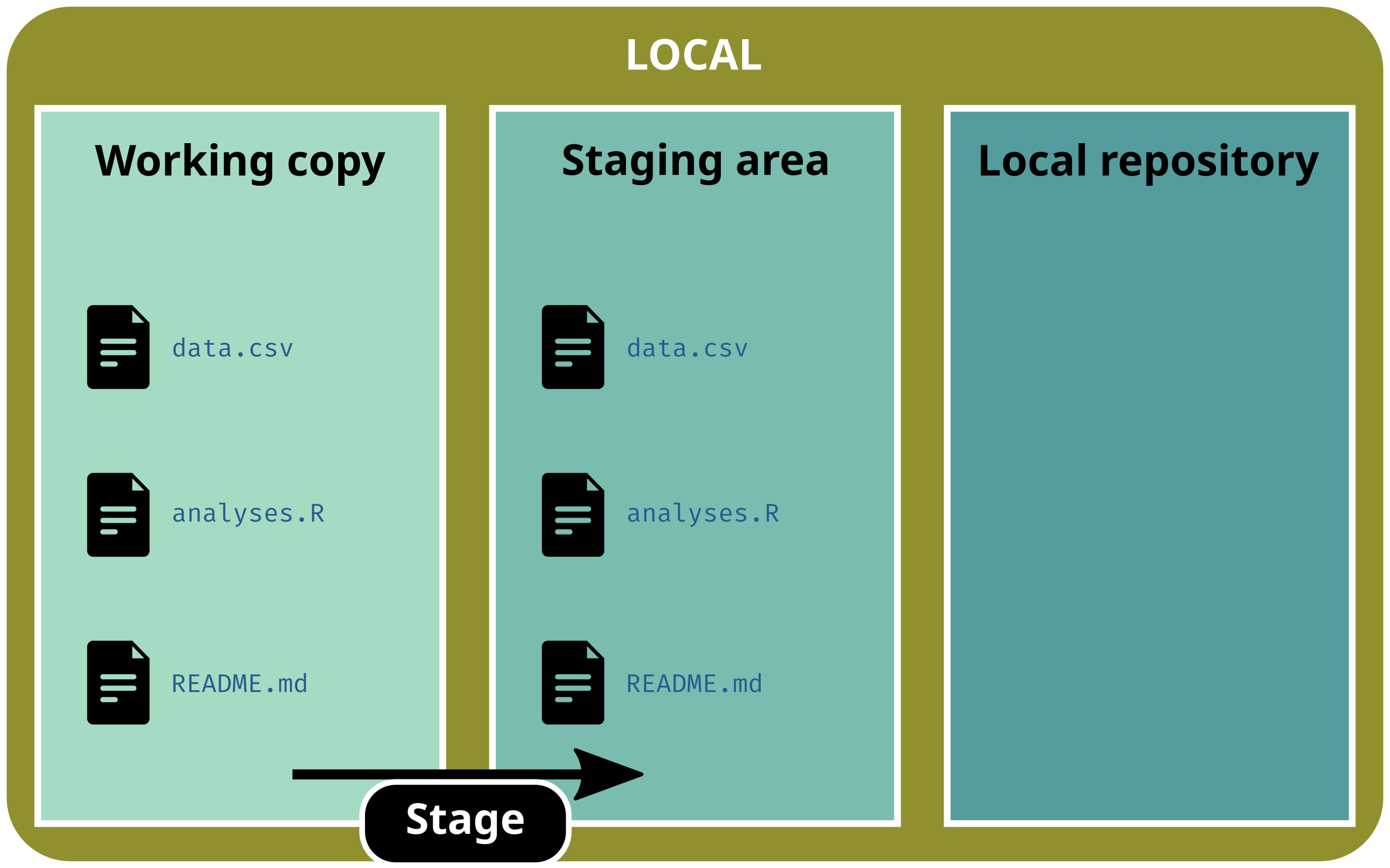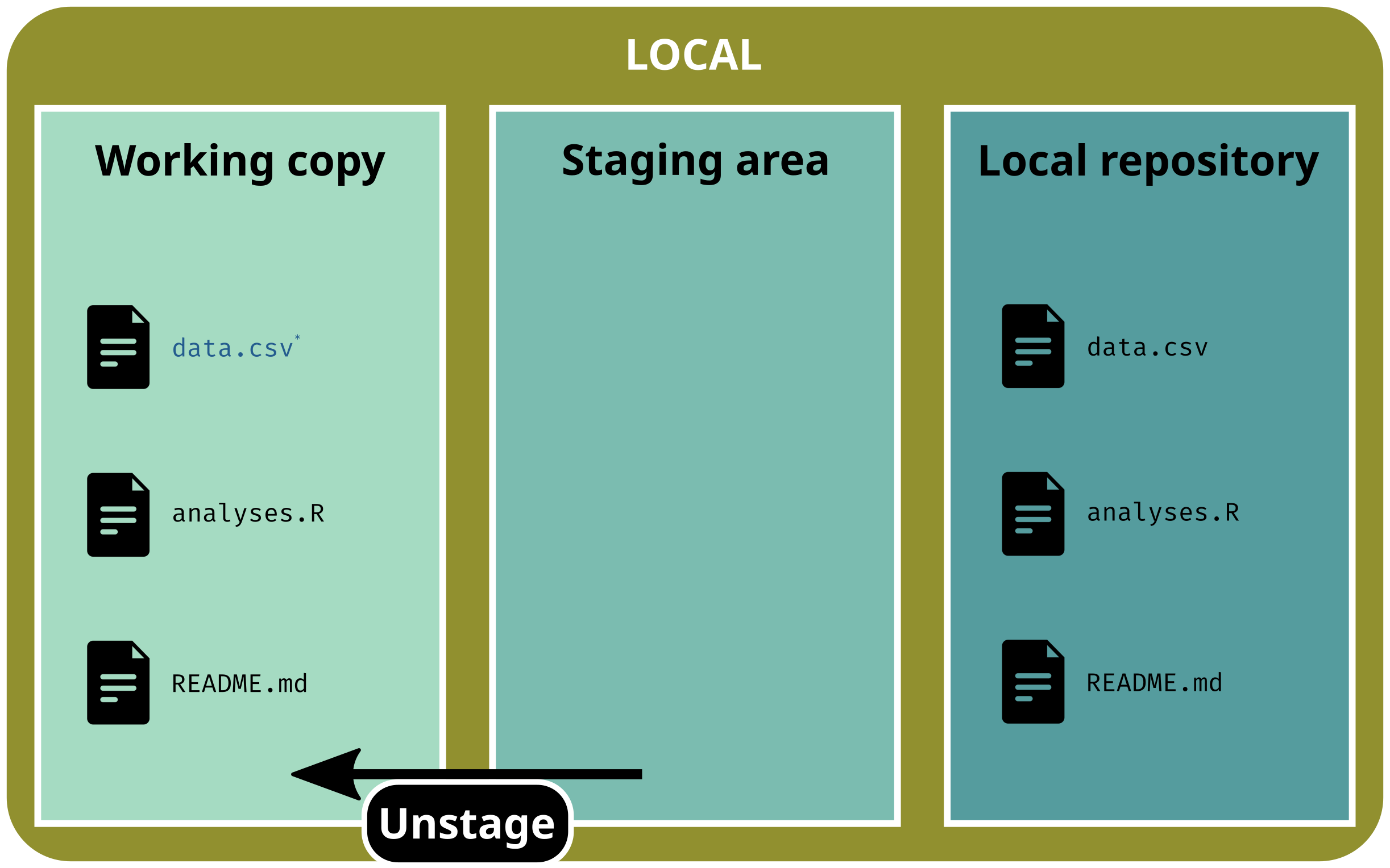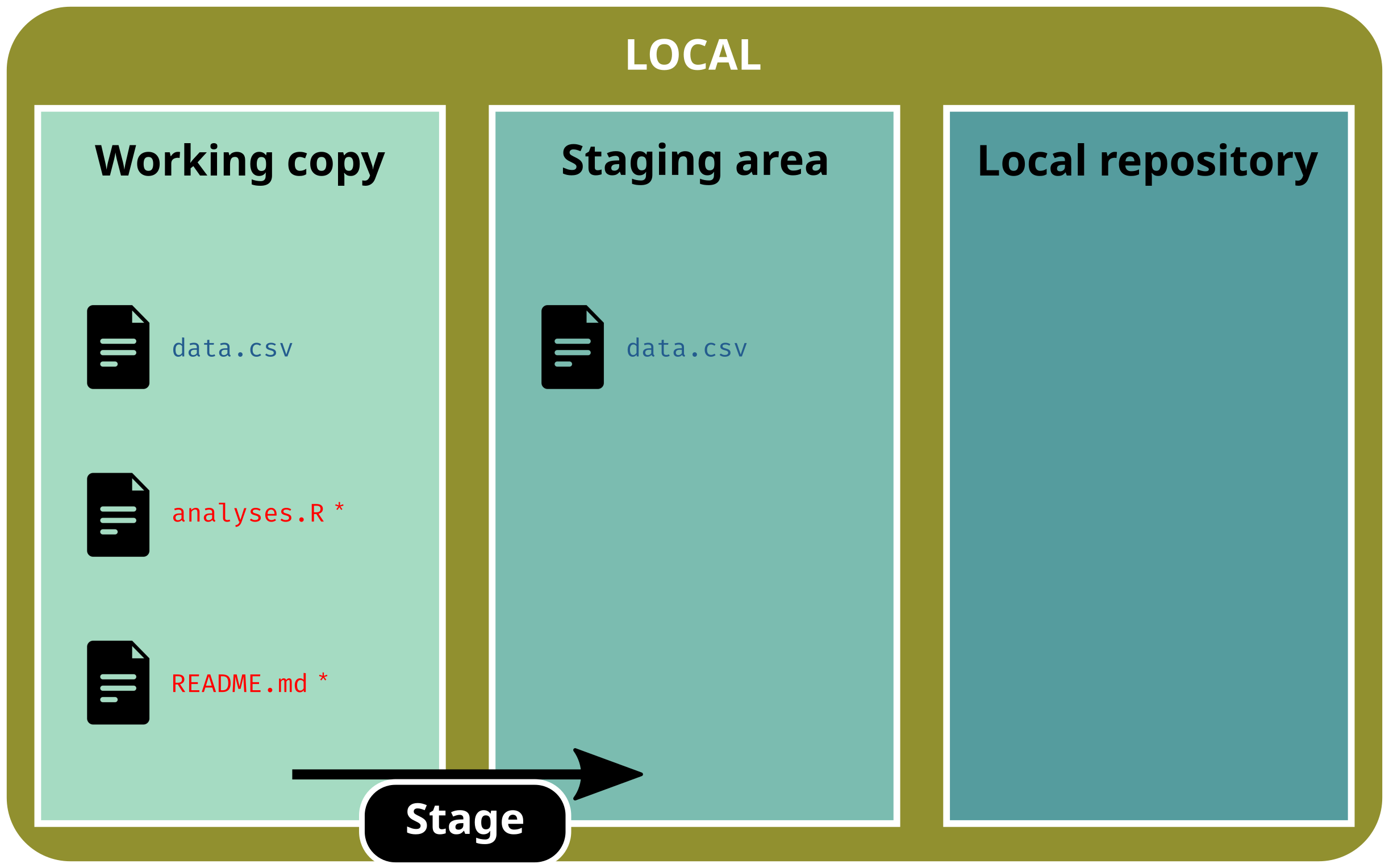 git status# On branch main# # No commits yet# # Changes to be committed:# (use "git rm --cached <file>..." to unstage)# new file: data.csv# # Untracked files:# (use "git add <file>..." to track)# README.md# analyses.R