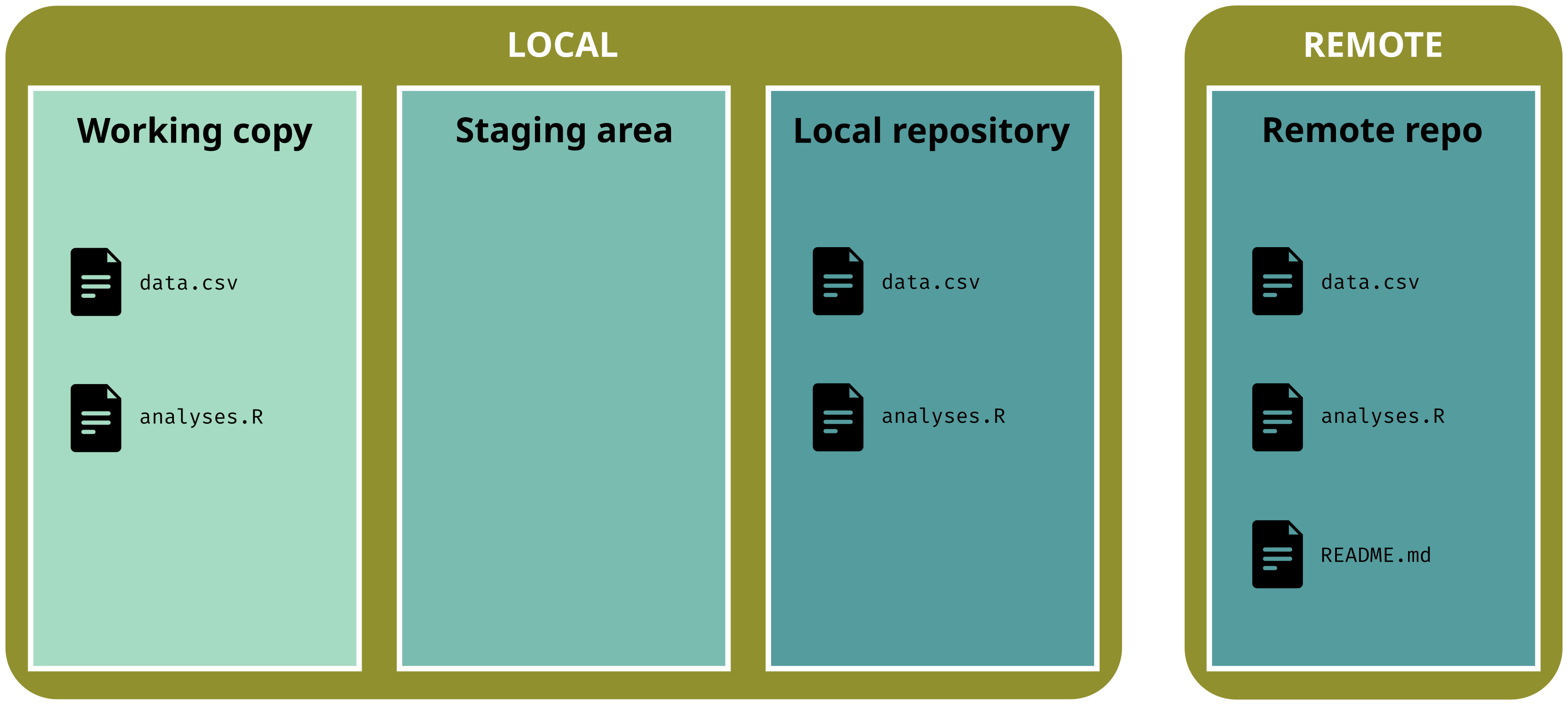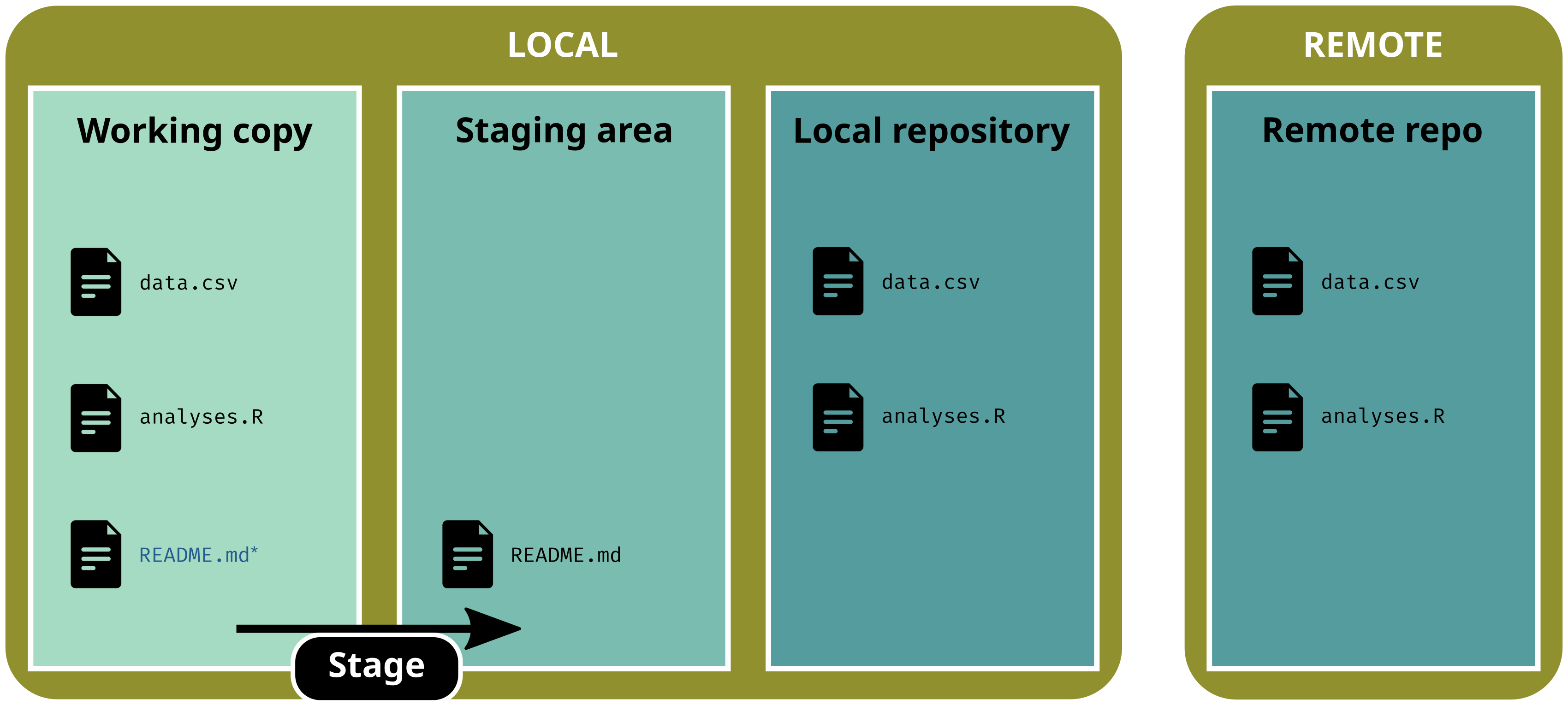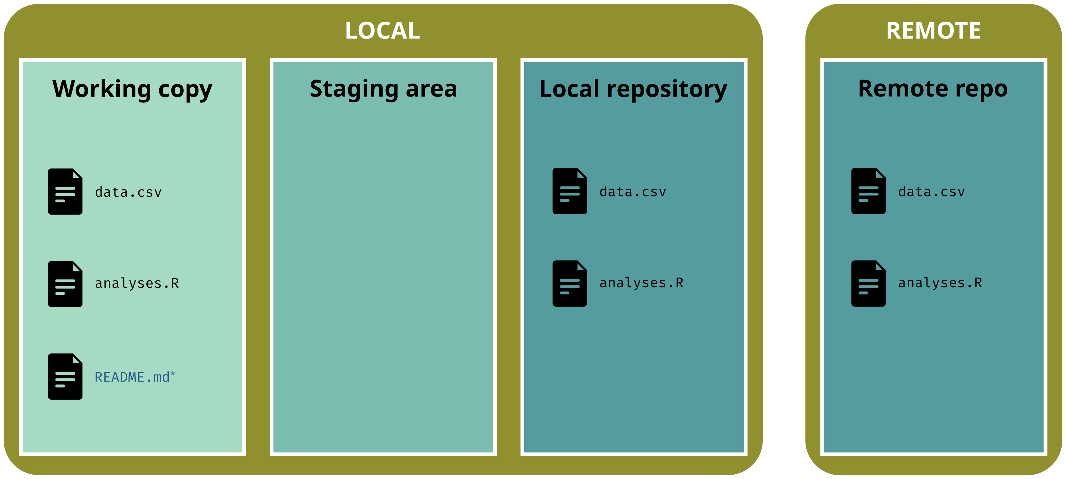 git status# On branch main# # No commits yet# # Changes to be committed:# (use "git rm --cached <file>..." to unstage)# new file: analyses.R# new file: data.csv# # Untracked files:# (use "git add <file>..." to track)# README.md