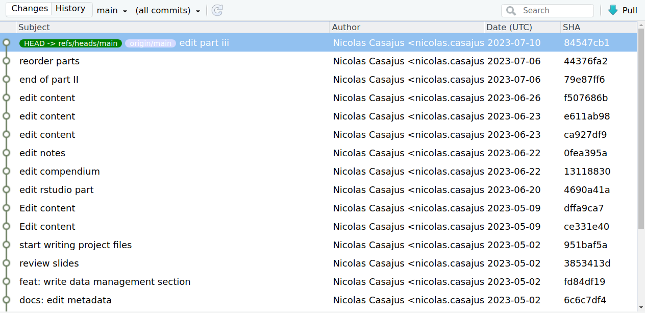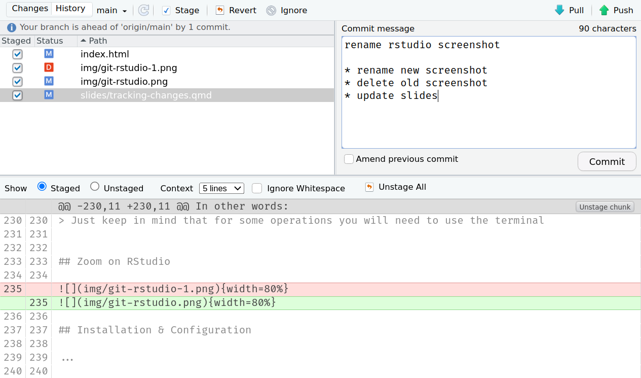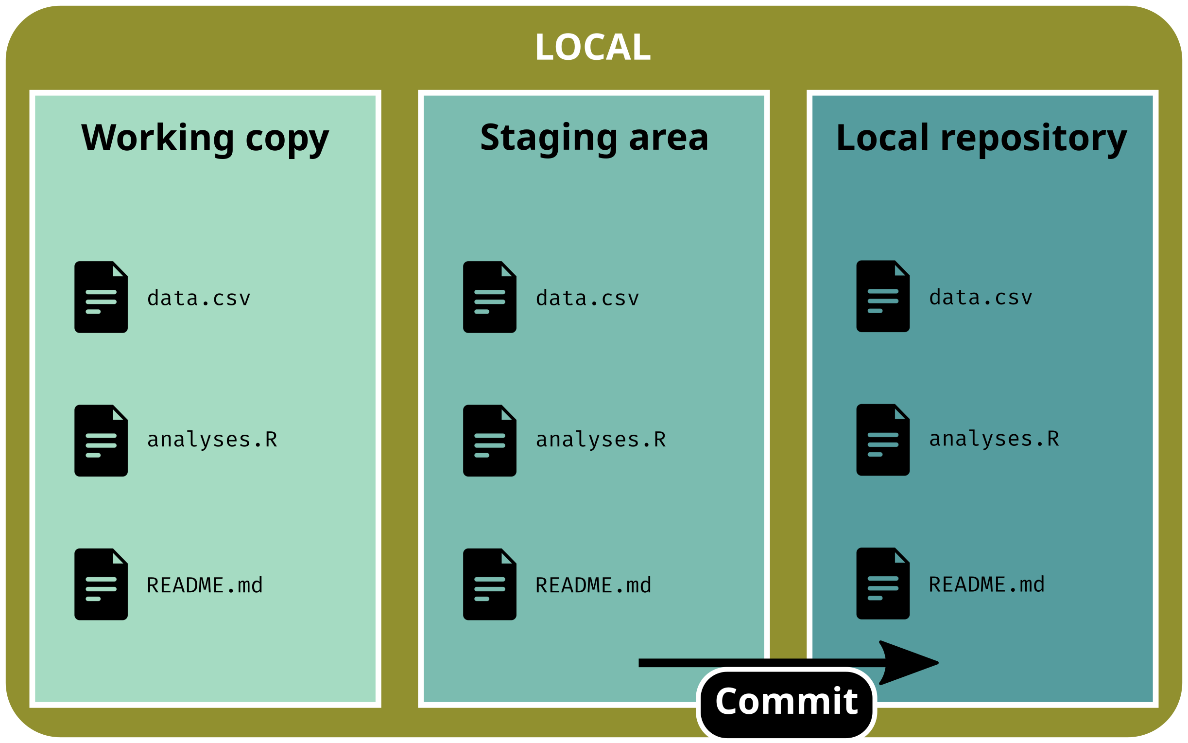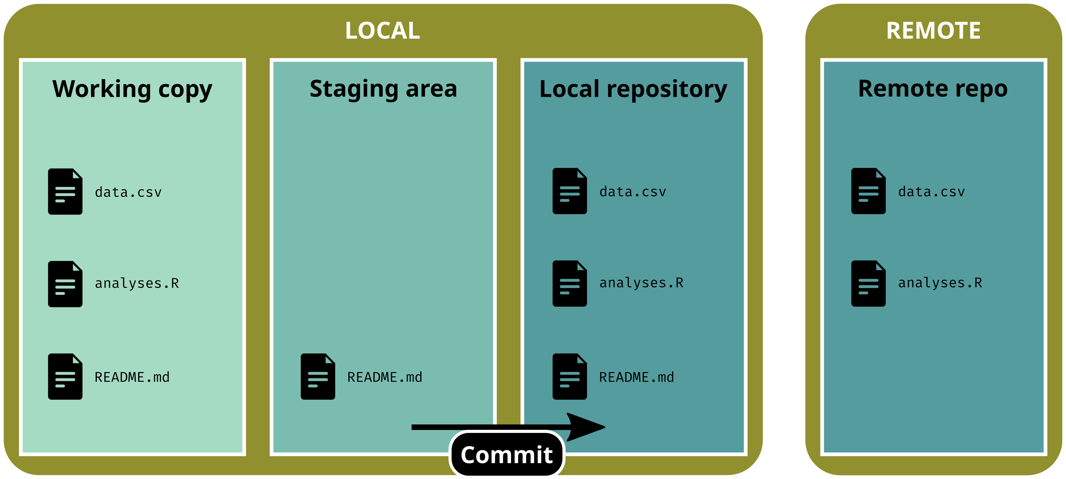 git status# On branch main# # No commits yet# # Changes to be committed:# (use "git rm --cached <file>..." to unstage)# new file: analyses.R# new file: data.csv# new file: README.md
