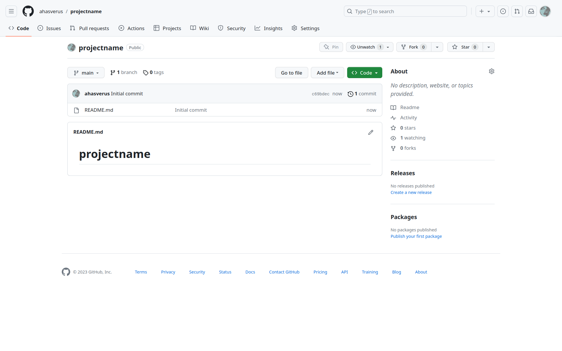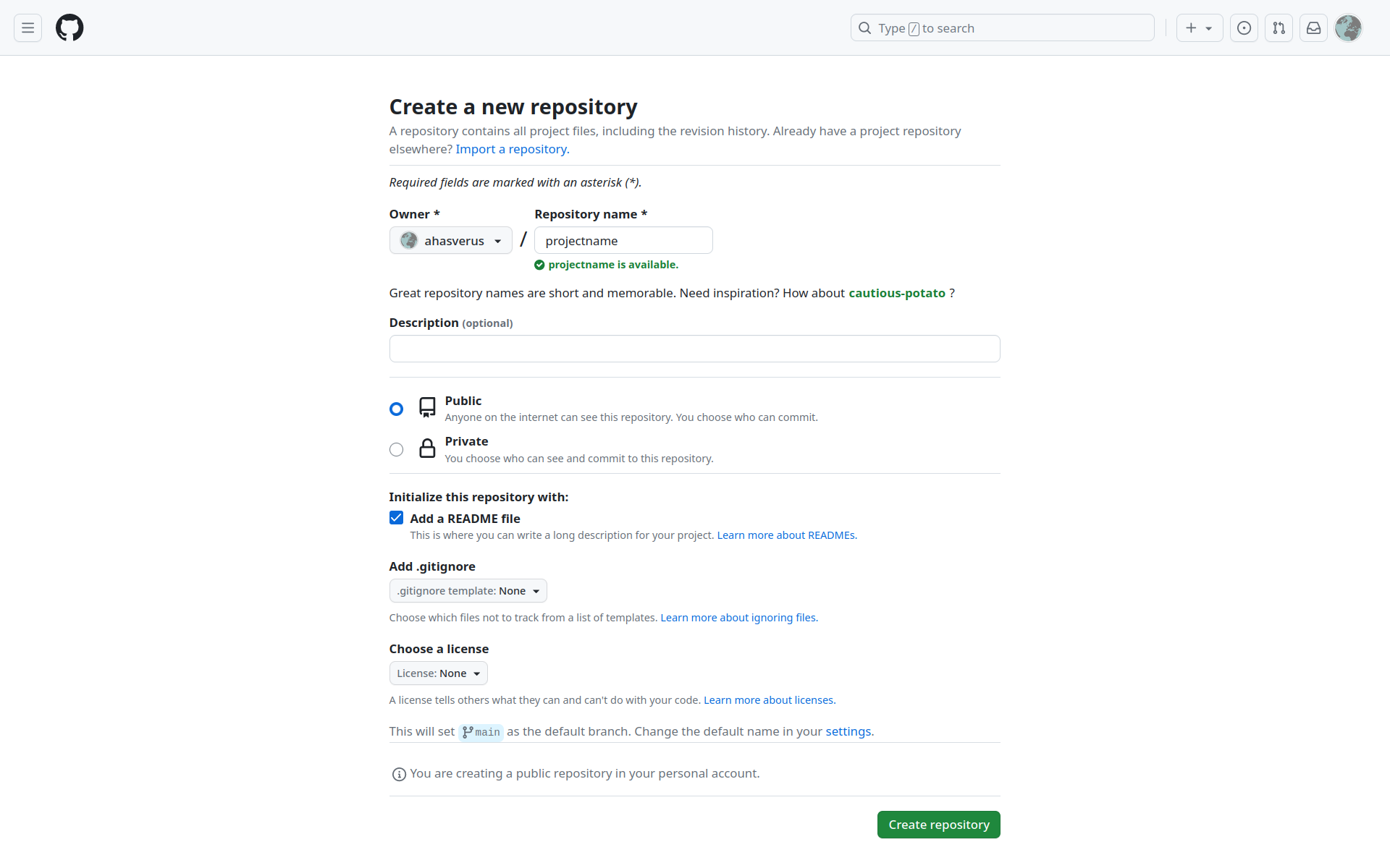 git push# To github.com:ahasverus/projectname.git# ! [rejected] main -> main (fetch first)## error: failed to push some refs to 'github.com:ahasverus/projectname.git'## hint: Updates were rejected because the remote contains work that you do# hint: not have locally. This is usually caused by another repository pushing# hint: to the same ref. You may want to first integrate the remote changes# hint: (e.g., 'git pull ...') before pushing again.# hint: See the 'Note about fast-forwards' in 'git push --help' for details.