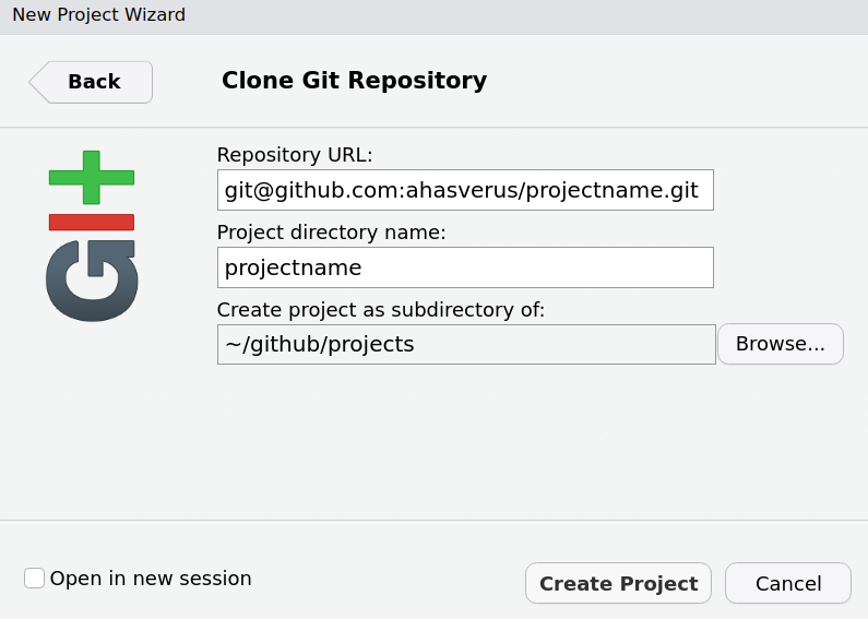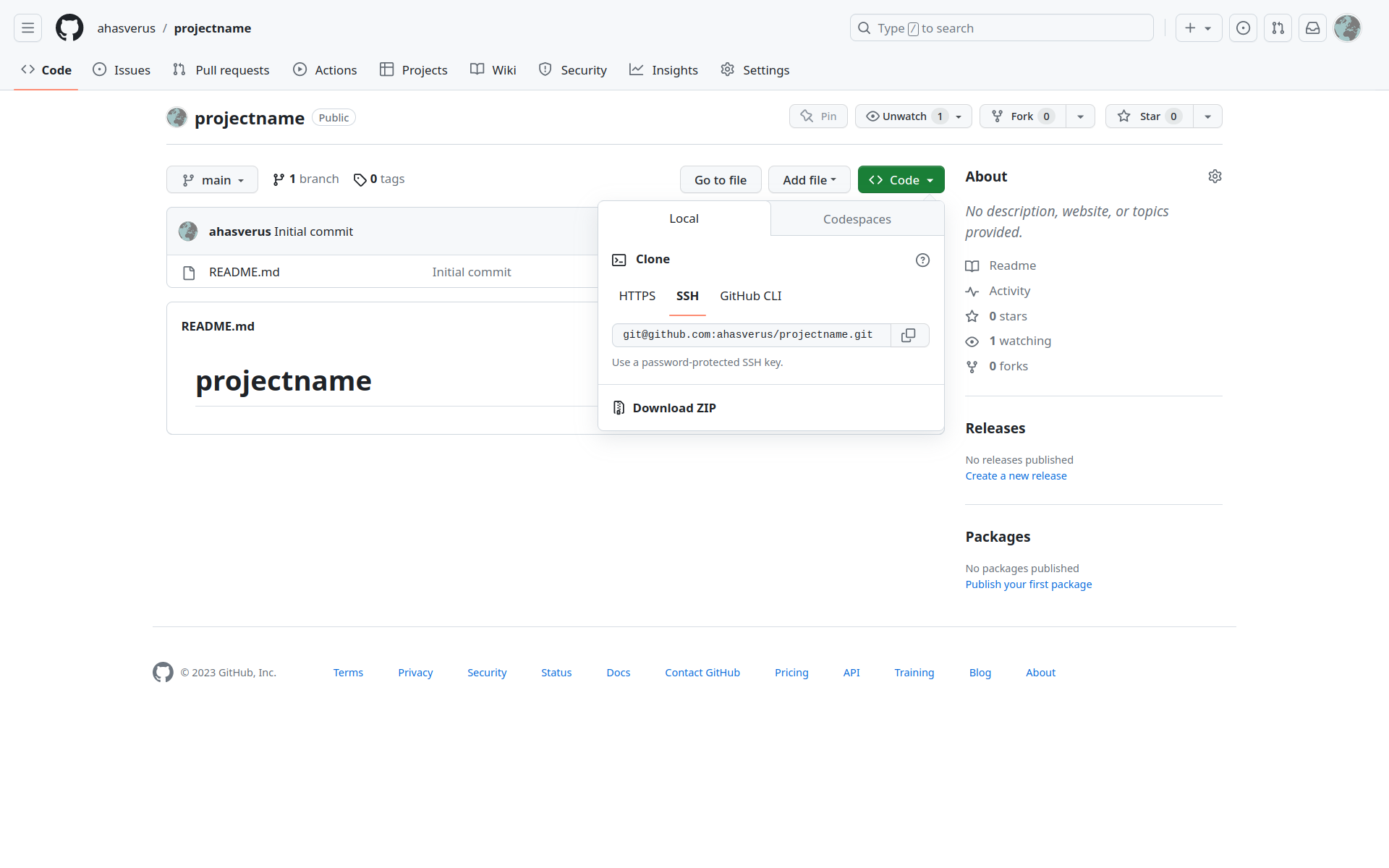 # Change pathcd path/to/store/repository# Clone repository (SSH)git clone git@github.com:ahasverus/projectname.git# Clone repository (HTTPS)# git clone https://github.com/ahasverus/projectname.git# Go to repocd projectname
