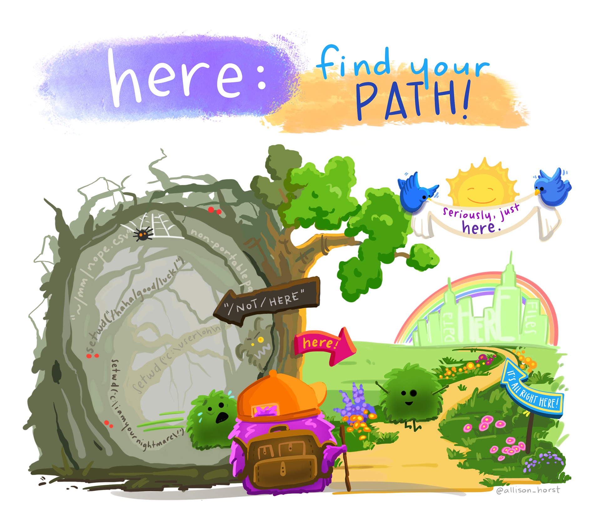# Output of here::here() on Windowshere::here()## [1] "C:/Users/janedoe/Documents/project"# Output of here::here() on MacOShere::here()## [1] "/Users/johndoe/Dropbox/work/project"# Output of here::here() on GNU/Linuxhere::here()## [1] "/home/johnsmith/git-projects/project"