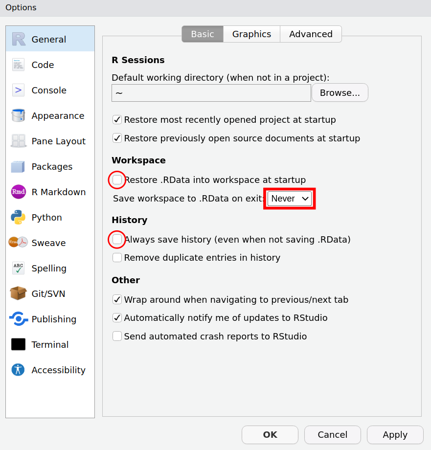 Never save your workspace as .RData Decide what you want to save and use save(), saveRDS(), write.csv(), etc.