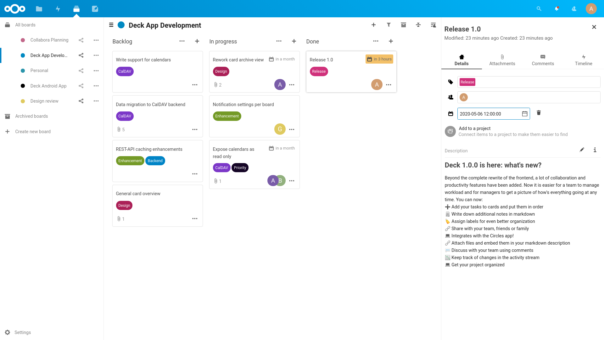 Nextcloud Deck is a kanban style organization tool aimed at personal planning and project organization for teams integrated with Nextcloud.