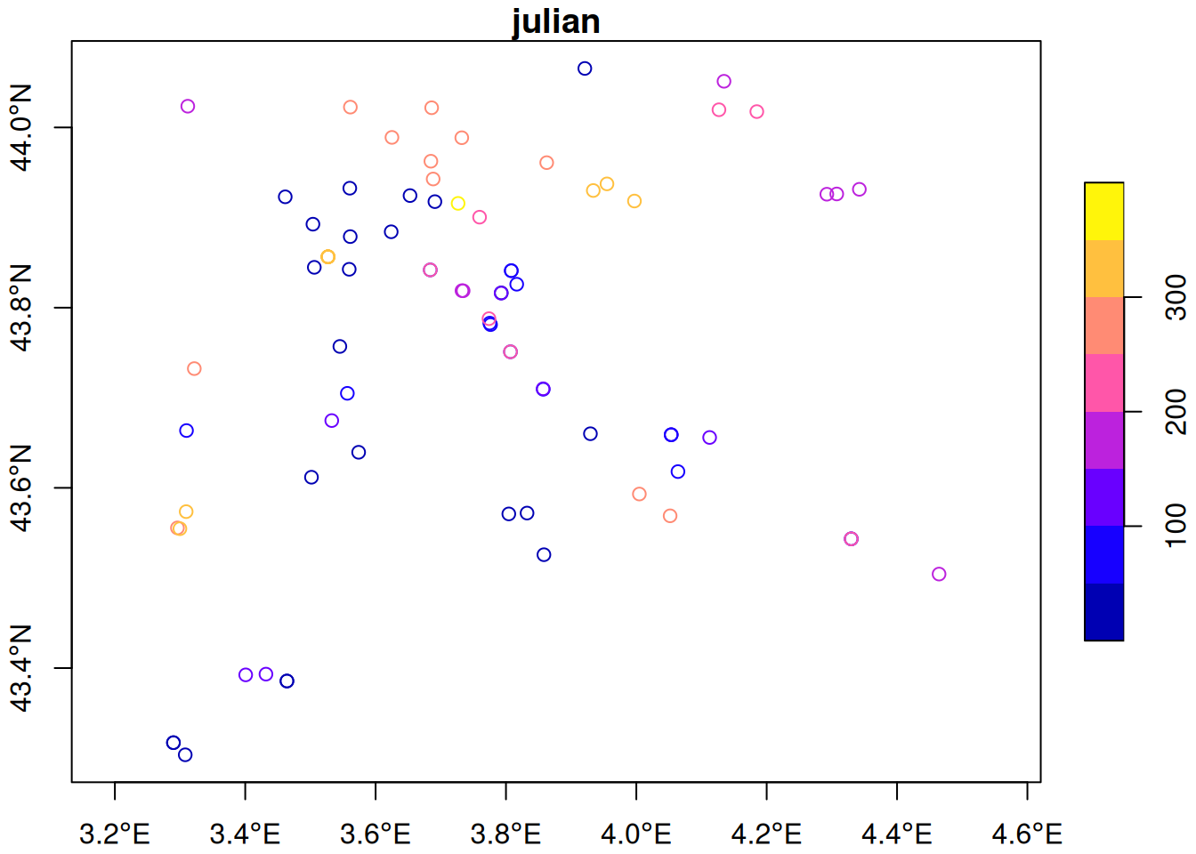 julian <- as.Date(pt_terra$eventDate) |> format("%j")Now we can attach the Julian day as a number in the spatial object. The attribute table can be accessed as a normal data.frame, and we can create a new column with $.