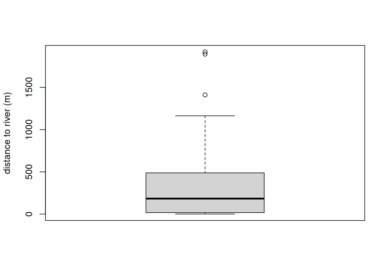 )boxplot(nearest_distance, ylab = "distance to river (m)")