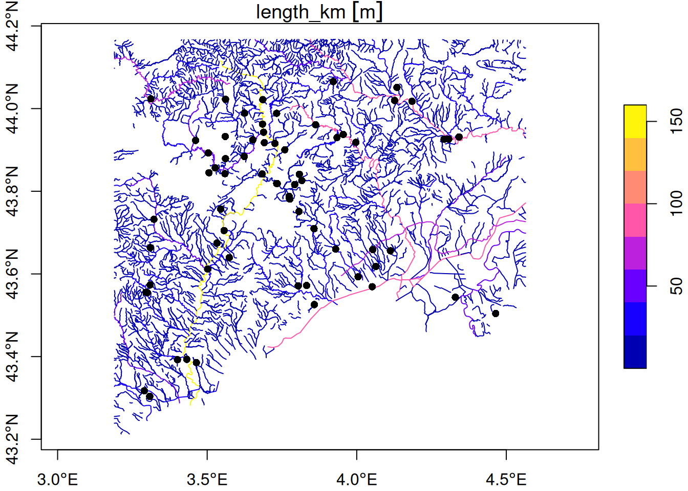 plot(river_sf["length_km"], reset = FALSE, axes = TRUE)