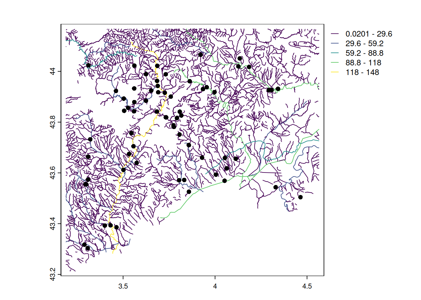 plot(pt_otter[, "dist_river"], add = TRUE, pch = 16)