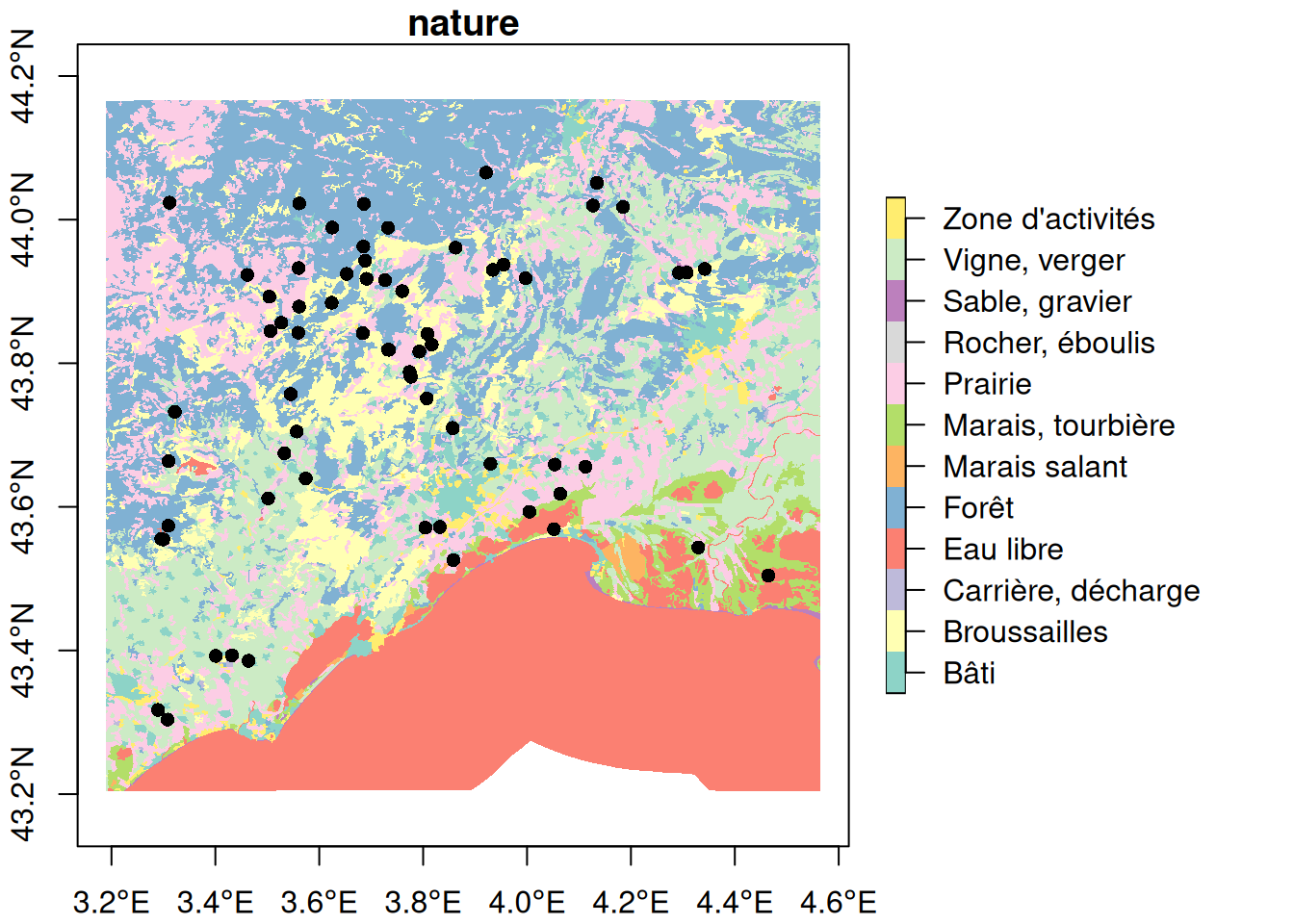 mapview(pt_otter, col.regions = "black")plot(landuse, y = "nature", border = NA)