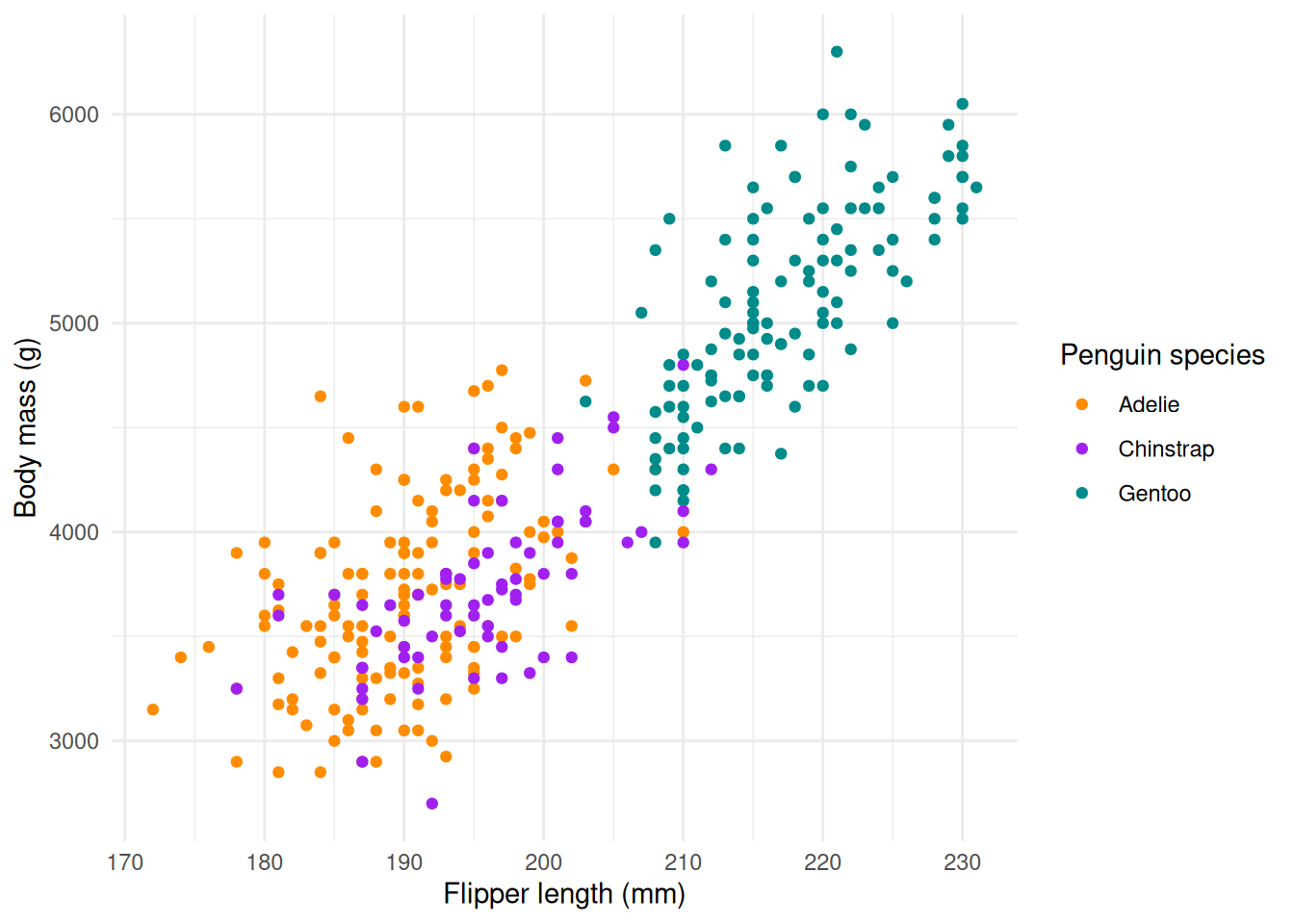 Let’s visualize the body mass in function of the flipper length, colored by species.